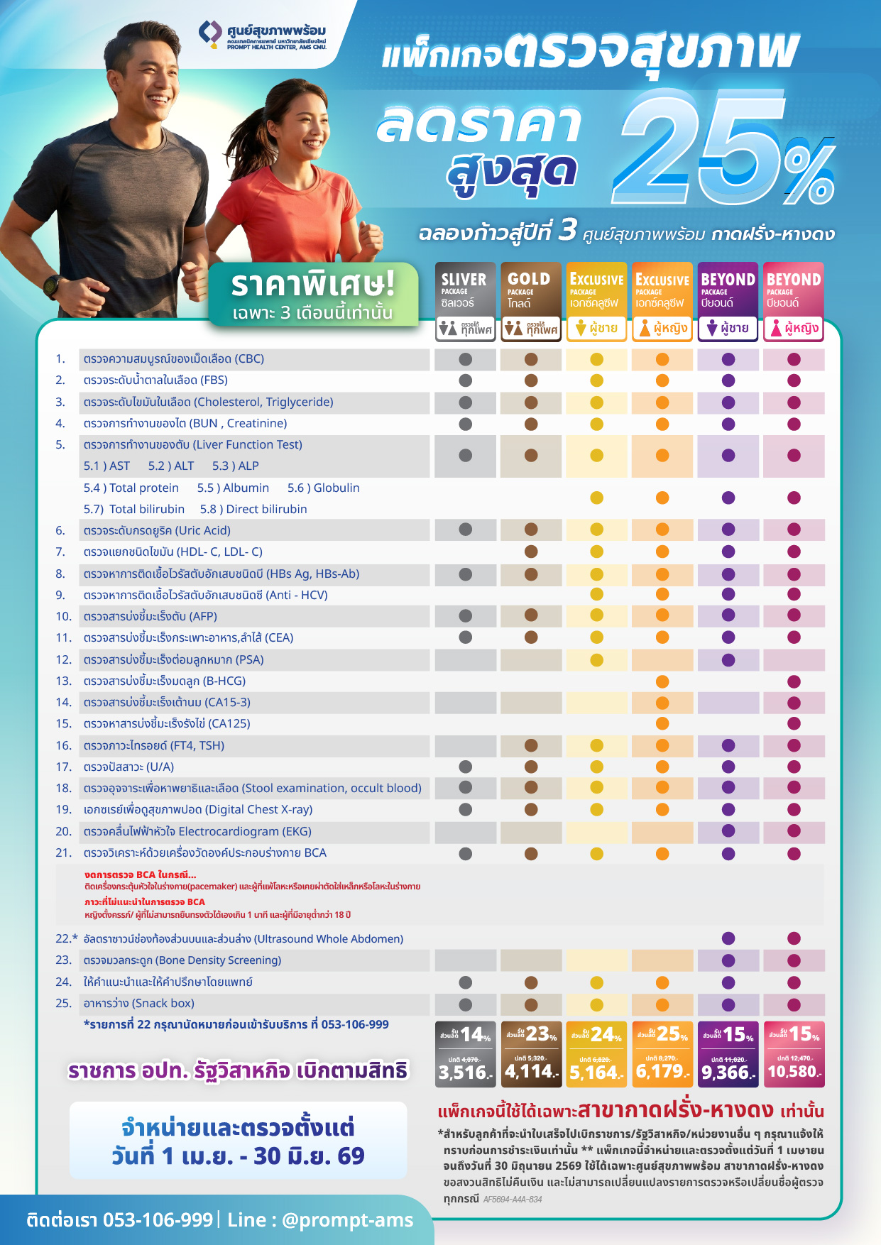 ตรวจครบ ครอบคลุม สูงสุดกว่า 24 รายการ เลือกได้ถึง 6 แพ็กเกจ (Silver / Gold / Exclusive / Beyond)